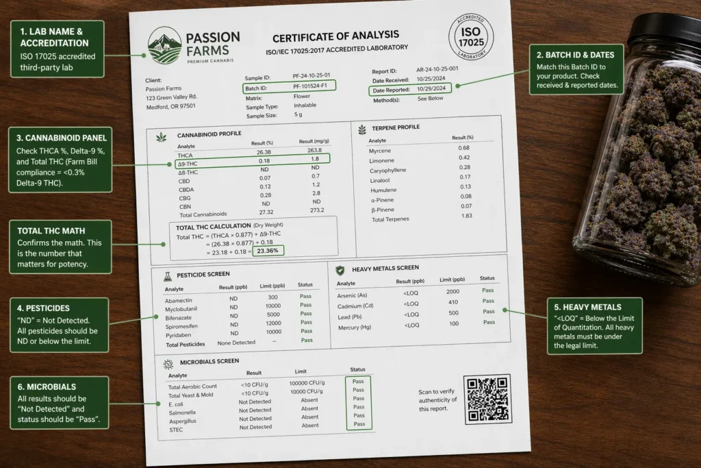 Here’s the thing. Forged and cropped COAs are everywhere in the THCA resale market right now. Screenshots pulled off Google. Batch IDs that don’t match the jar in front of you. Pesticide panels conveniently chopped off the bottom of the page. This guide exists to show you what a real lab report looks like, using an actual Passion Farms COA, so you can spot a fake in about thirty seconds flat.